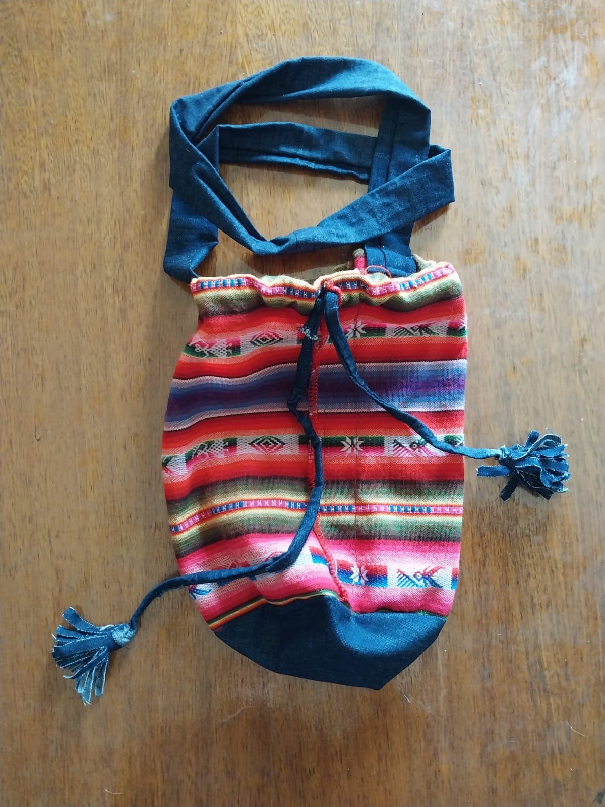 Bolso estilo Wayuu elaborado con materiales reciclados. Este bolso que imita los bolsos tipicos del Caribe colombiano combina el respeto por el medio ambiente con un diseño auténtico y funcional. Con una estructura confeccionada en tela de aguayo y detalles en jean en el fondo, correa y cierre con correa, es un accesorio único que une tradición y modernidad para quienes buscan estilo sin comprometer la sostenibilidad.